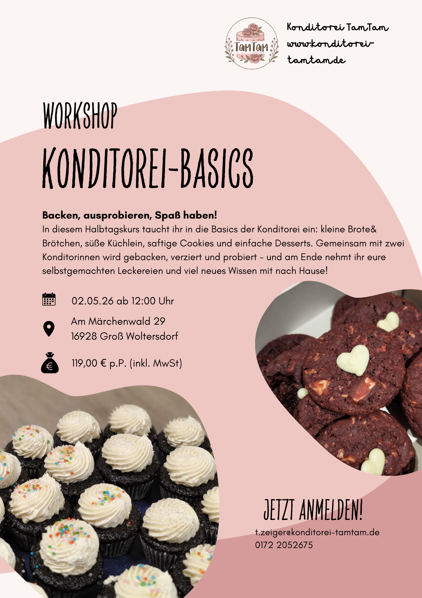 Ich bin Tahnee, Konditormeisterin aus Pritzwalk. In meiner kleinen Konditorei entsteht alles mit Liebe, von der Torte bis zum Dessertbuffet - individuell, kreativ und auch für Allergiker*innen. Ich freue mich darauf, eure Ideen in kleine (oder große) Genussmomente mit TamTam zu verwandeln!